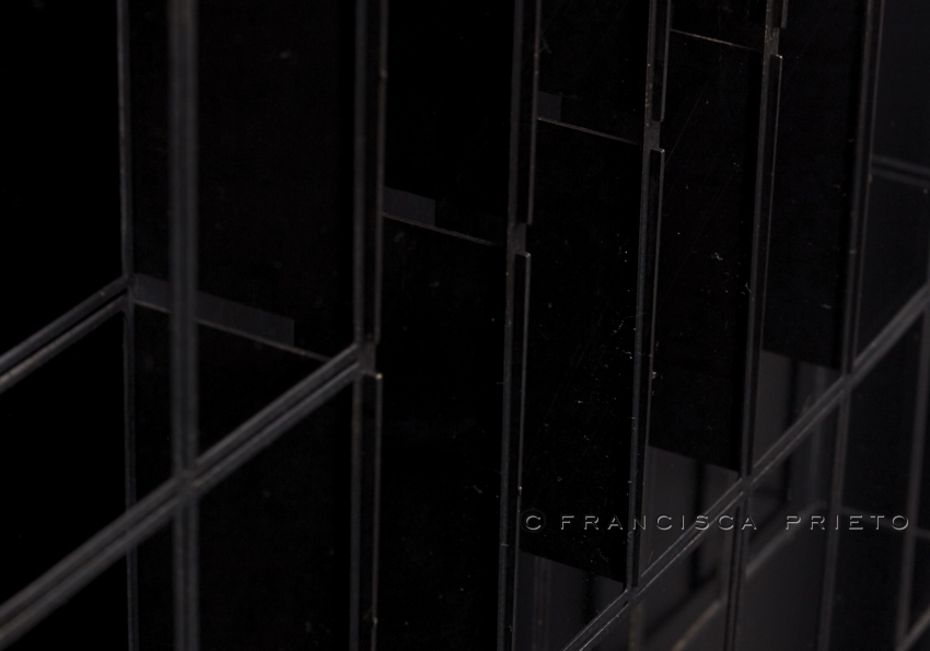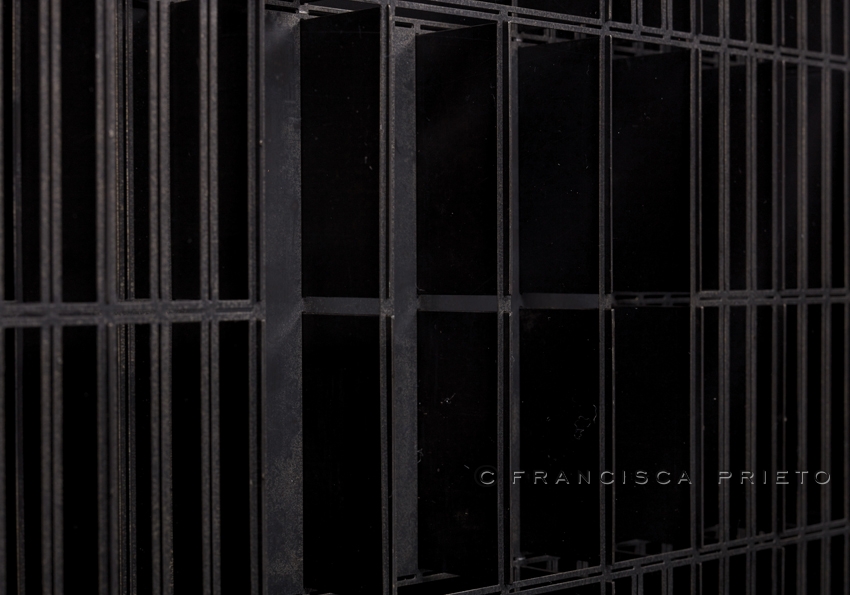 To be absorbed is to be pulled in, to be completely held in concentration and thought, summoning a glorious nothingness across the mind as everything else falls away. Black, the absorption of all colour, of all light, epitomises this state, the depths of an abyss with no beginning or end. The tightening gridlines of the Absorbed diptych mirror the contorting and contracting of the mind’s eye, the grappling of understanding something we cannot see but by which we are consumed. Flickers of light, silvery echoes of comprehension, cling to the metal structure, barely visible and matt like the immersive black that surrounds. Built through Francisca’s careful treatment of the metal, they are spaces for possibilities, holding scope from which to construct and create, from the profound state of absorption.