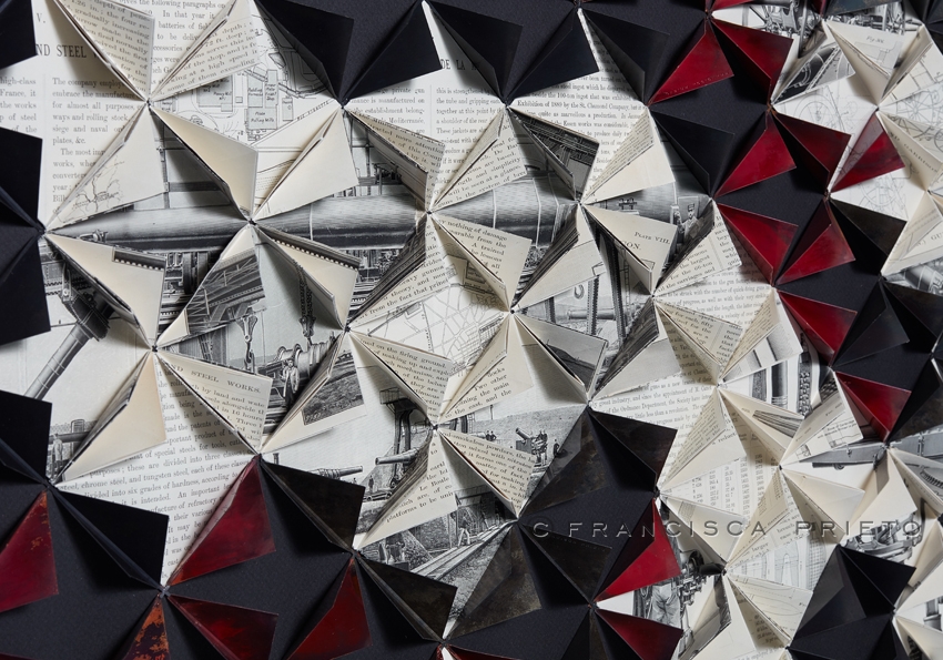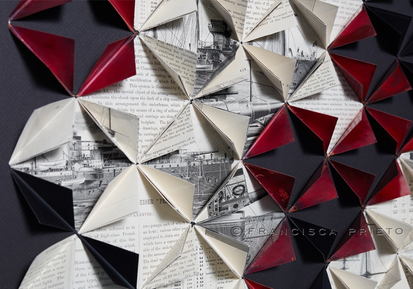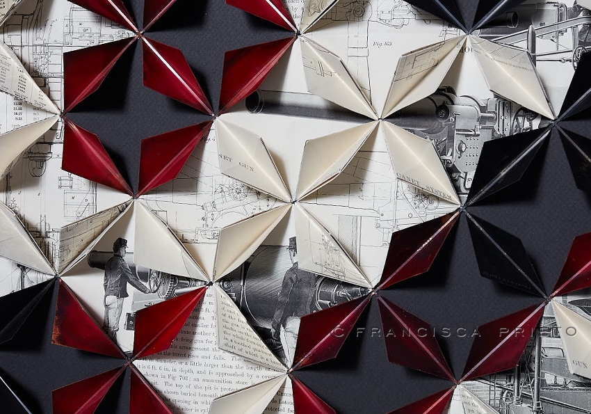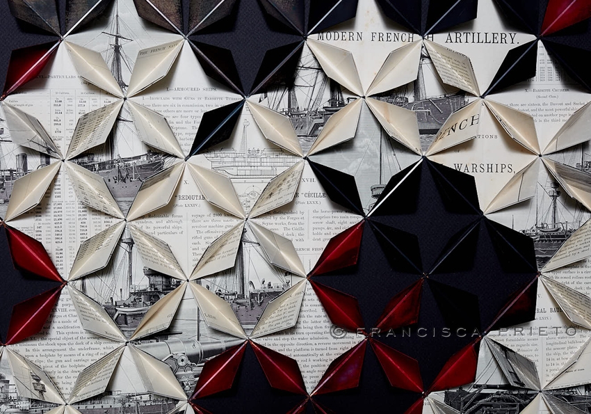 The pages of Modern French Artillery look to celebrate the advancement of weaponry in the late 1800s, yet their detail reveals layers of stories that questions the lines of intent. Emerging from the pages are intricate illustrations of warships, lists of numerous weapons and the impressive weight and firing range of ammunition; a metallic multiplicity of epic proportion. Darkly these images are framed by the shadows of time and consequence past, black as the blinding smoke of cannons and the depths of the sea that keeps many watery graves. This darkness is punctuated with the jagged edge of intense crimson, the deep welling of blood shed by these inventions.