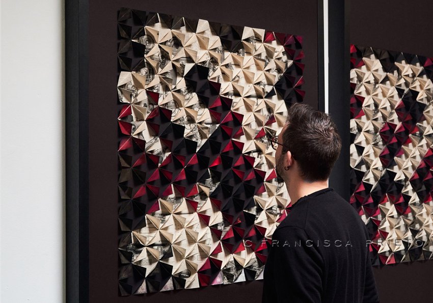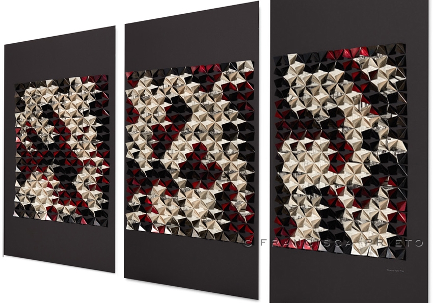 The wheels of cannons, turning circles of machinery and the long shafts of gun barrels run across the folds; cool, large and metallic, emphasising sheer size, power and tenacity. The guns’ aim points inward from each side of the triptych; Francisca turns them against one another in crossfire, a reminder of the uncertain and quick changing nature of war. In the centre are the ships, immense and pointed structures, emerging as ghostly skeletons of fraught battles tossed about on the waves. Tiny men – miniature at the wheel of enormous weapons or lined like figurines on deck – remind of scale and the reality of fighting, of the inevitable mass loss of life. ‘Intention’ is a powerful work, reframing a history all too often told with bravado and conquest. These images were drawn from reality and though today our battles look very different, the lines of intention are just as questionable.