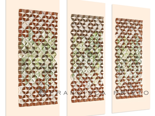 Across the tryptic Resilience, the many faces of the British fern are given a stage. Waving fans of fronds, unfurling from their prehistoric curl, dance to the breeze of evolution through Prieto’s folds. The fractal geometry of the fern, the mathematically revered pattern of division, holds our gaze, each varying yet consistent stem carrying our eye to the next. Rich greens, each detail darkening to the plant’s true imprint, bewitch our wandering eye, leading to delicate tips of buds and spirals of wandering leaf. Their growth across three works – the size an homage to such endurance – is illuminated by gleaming shards of metallic earth. The burning orange of copper mimics the rich soil.