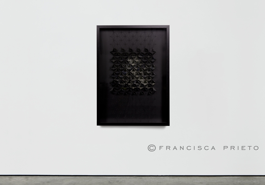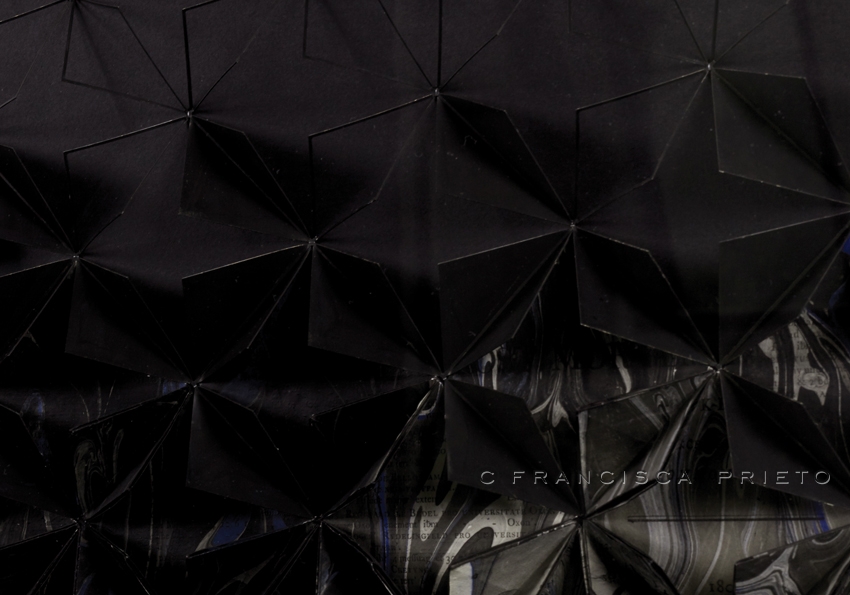 Barely visible, Ashes to Ashes has no beginning and no end. Shadowy lines harden to indistinguishable points, held in an abyss of black. They are caught in one world and refracted ever-lasting into the next, with the work framed in reflection by mirrors. Surrounded by such never-ending and metallic darkness, life is fragile in paper; the leaves of life gone by. Words are obscured by marbling, a shimmering smoke of undulations covering the names of the long dead. Silver to black, white to dust, colour is barely visible, only a trace of deep and pungent blue – tantalising and whispering of the beyond. Blue is a glimmer of the unspoken, the sprit of these listed names and the land they left behind.