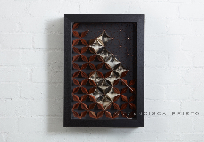 Collected from nineteenth-century newspapers, Francisca was drawn to these portraits not for their advertised beauty, but for the feelings their faces betray. In a time when women were rarely allowed to vent their true emotions or be outspoken, these haunting faces tell us what of course we already know – that more goes on behind the veil of propriety. Drawing out the eyes, the windows to the soul, the intensity of these gazes ignite the fiery shards of bronze that surround them. Reflected and refracted, the power of such emotion survives across the darkness of time, as Francisca holds these figures up as constellations in the depths of a night sky. Mirrored by sharp and winking edges the pointed strength of woman hardens from the page.