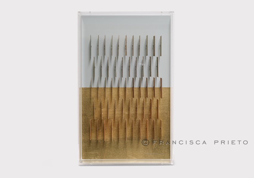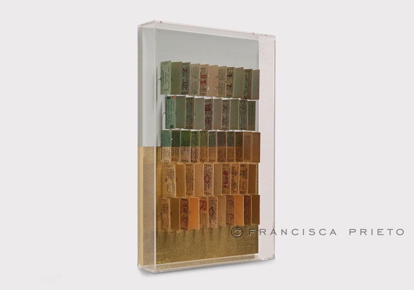 Gold is a shimmering ideal here: tantalising memories, rich and reflective as one’s cultural heritage. Yet the colour of reality dances upon the gilding, bright in blues and pinks, and then more subtle in the paper-coloured tickets of everyday life. The separation between the two is clear, yet the distinction is less marked than the other Echoes series, reflecting the interplay between cultural influences and the undeniable impact of one’s background on their experience.
