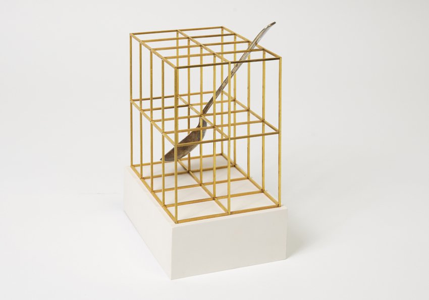 Prieto uses collected objects of the past, understatedly arresting in their beauty and craftsmanship, their chipped metalwork or well handled surfaces conjuring images of past hands. These objects of action and purpose are immobilised, suspended in an entrapment that represents the invisible cages in which women have found themselves across history. Each metal bar illustrates the barriers put between women and their aspirations, lines of control and denial.