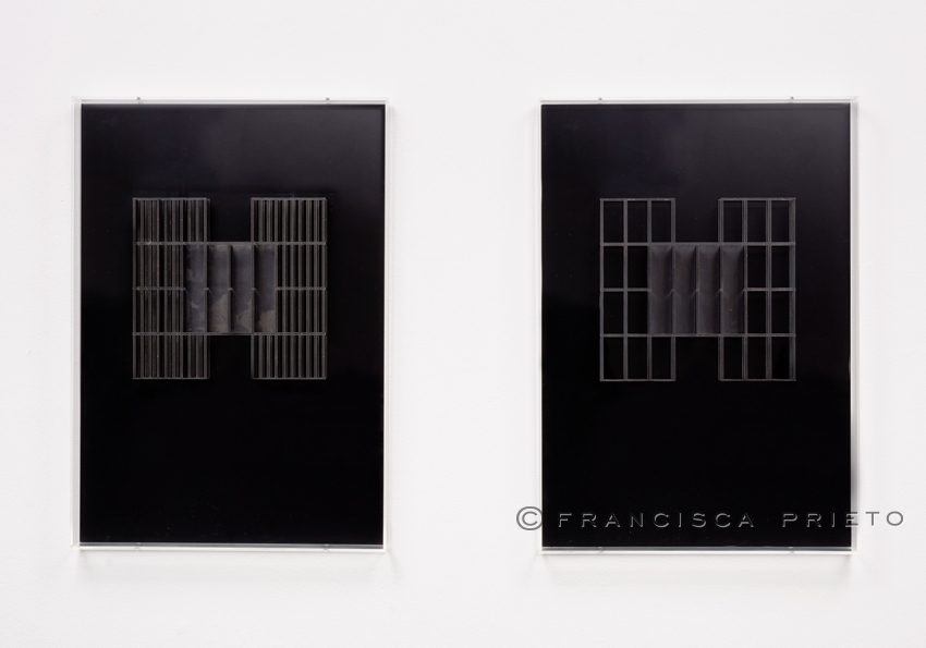 To be absorbed is to be pulled in, to be completely held in concentration and thought, summoning a glorious nothingness across the mind as everything else falls away. Black, the absorption of all colour, of all light, epitomises this state, the depths of an abyss with no beginning or end. The tightening gridlines of the Absorbed diptych mirror the contorting and contracting of the mind’s eye, the grappling of understanding something we cannot see but by which we are consumed. Flickers of light, silvery echoes of comprehension, cling to the metal structure, barely visible and matt like the immersive black that surrounds. Built through Francisca’s careful treatment of the metal, they are spaces for possibilities, holding scope from which to construct and create, from the profound state of absorption.