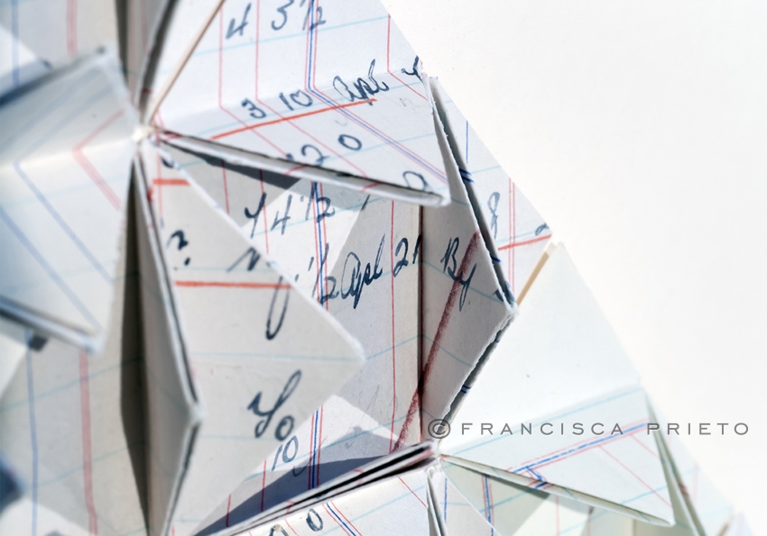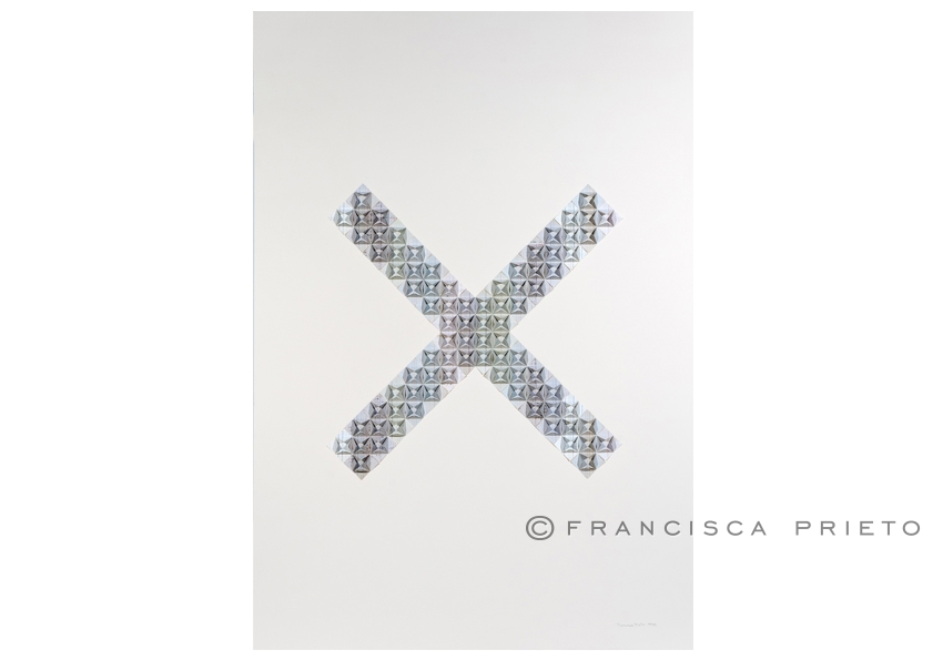 In Composition No.5 Francisca draws on the quiet beauty her collected ephemera can possess. Using only pages of old ledger books – seemingly useless and perfunctory – she builds this loaded symbol with a soft graduation of colour. A ripple of pastel hues – green, blue, yellow and pink – form this mark, which is so often hardly penned in red or black. The diagonals of the composition are countered by the vertical lines within the folds; repeated at various intervals, these draw our eyes down, through the created pattern of space and words – the ‘empty’ and ‘filled in’. This subtlety, created using the most basic of material, quietens our instant recognition – and associations – of this symbol with many meanings.