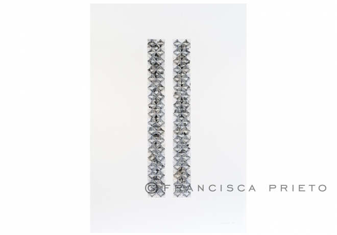 The regimented symmetry of Composition No. 8 is playfully set alive with the busyness of newspaper print. As newspapers are usually set in straight flat columns, content here is given a three-dimensional movement from within, drawing attention to the print’s wonderful eccentricities. Uppercase, emboldened and flamboyant text shrinks and grows up the folded pages, crowding the illustrations that show just how peculiar the interests of a nineteenth-century readership was. The impossibly narrow corset is set across from the shining pistons of Victorian invention, pills and remedies are enticingly inviting; all in a tumult that is set off by the strong, almost luminous, blue with which Francisca hems them.