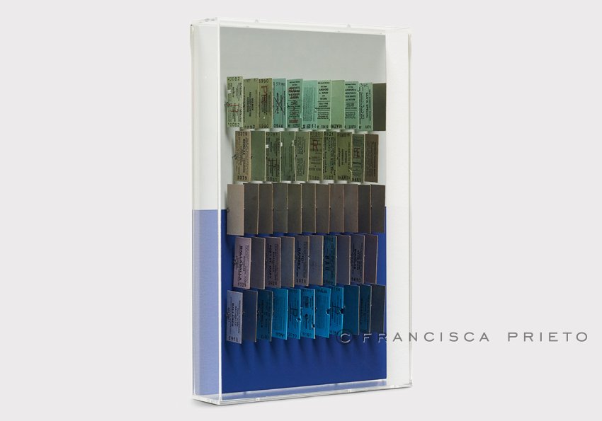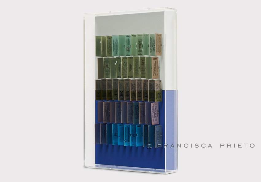 Each distinct half of the work speaks to a separate chapter of Francisca’s journey or personal experience. Sometimes bold, sometimes soft, the colours are enlivened by the rippling of the collected railway tickets, suspended paper brush strokes which are themselves symbols of travel and memory. These rich and complex tones fill the frames with playful dynamism of colour, mirroring the distinct influences of two cultures that come together to create a narrative of identity.