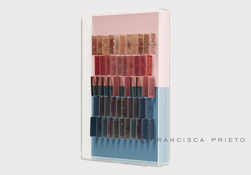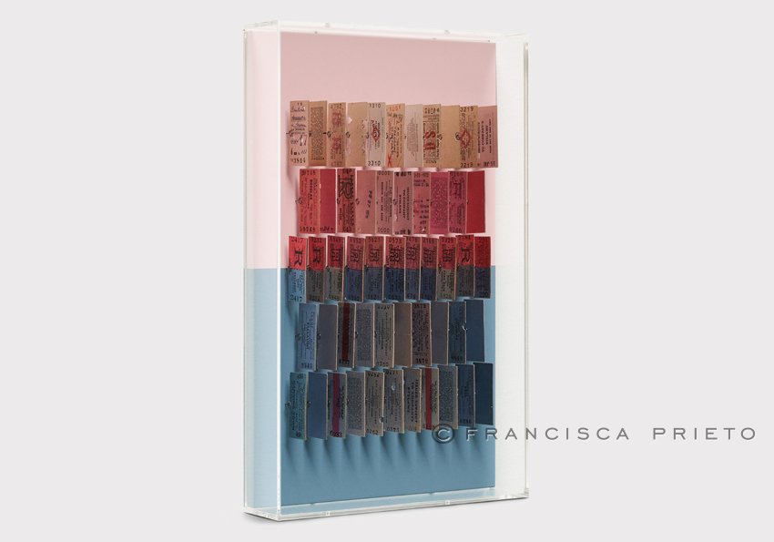 Each distinct half of the work speaks to a separate chapter of Francisca’s journey or personal experience. Sometimes bold, sometimes soft, the colours are enlivened by the rippling of the collected railway tickets, suspended paper brush strokes which are themselves symbols of travel and memory. These rich and complex tones fill the frames with playful dynamism of colour, mirroring the distinct influences of two cultures that come together to create a narrative of identity.