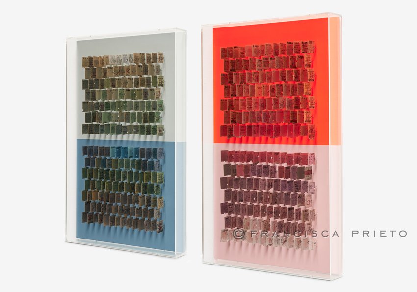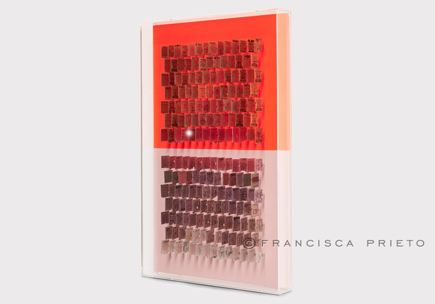 The tickets share a similar colour palette throughout each work, unified as one person, though their tones shift across the contrasting halves of the background, representing how identity subtly changes across different places. The visual and physical separation between the two halves is stark, with the vibrancy of bright and bold colour juxtaposing the cooler quieter tones. Despite this division, the tickets – through their colour, format and alignment – bridge the gap; they embody the constant of an individual in two coexistent worlds.