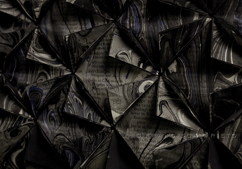 Barely visible, Ashes to Ashes has no beginning and no end. Shadowy lines harden to indistinguishable points, held in an abyss of black. They are caught in one world and refracted ever-lasting into the next, with the work framed in reflection by mirrors. Surrounded by such never-ending and metallic darkness, life is fragile in paper; the leaves of life gone by. Words are obscured by marbling, a shimmering smoke of undulations covering the names of the long dead. Silver to black, white to dust, colour is barely visible, only a trace of deep and pungent blue – tantalising and whispering of the beyond. Blue is a glimmer of the unspoken, the sprit of these listed names and the land they left behind.