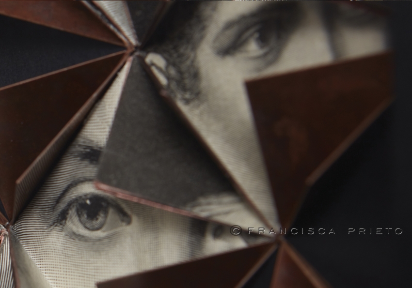 Collected from nineteenth-century newspapers, Francisca was drawn to these portraits not for their advertised beauty, but for the feelings their faces betray. In a time when women were rarely allowed to vent their true emotions or be outspoken, these haunting faces tell us what of course we already know – that more goes on behind the veil of propriety. Drawing out the eyes, the windows to the soul, the intensity of these gazes ignite the fiery shards of bronze that surround them. Reflected and refracted, the power of such emotion survives across the darkness of time, as Francisca holds these figures up as constellations in the depths of a night sky. Mirrored by sharp and winking edges the pointed strength of woman hardens from the page.
