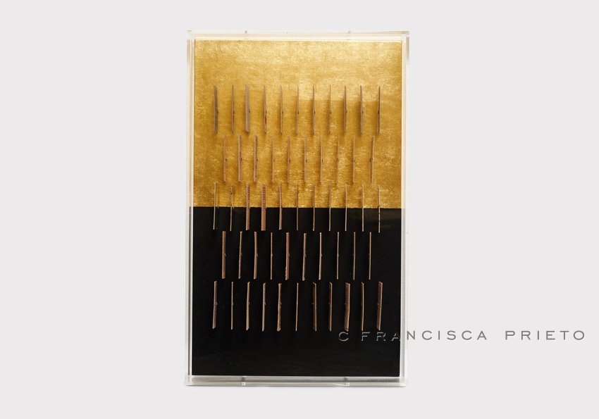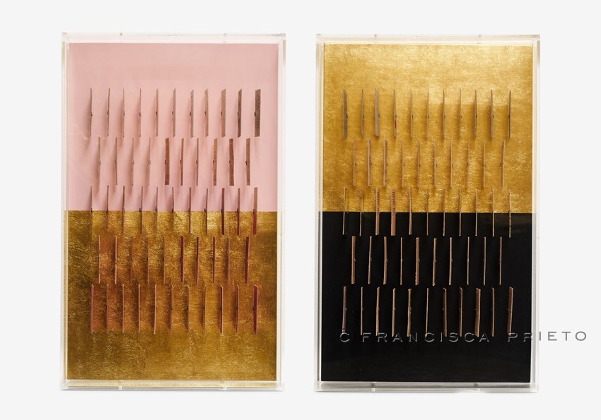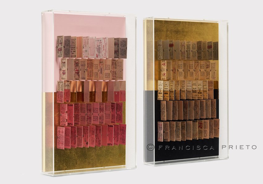 Gold is a shimmering ideal here: tantalising memories, rich and reflective as one’s cultural heritage. Yet the colour of reality dances upon the gilding, bright in blues and pinks, and then more subtle in the paper-coloured tickets of everyday life. The separation between the two is clear, yet the distinction is less marked than the other Echoes series, reflecting the interplay between cultural influences and the undeniable impact of one’s background on their experience.