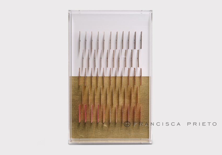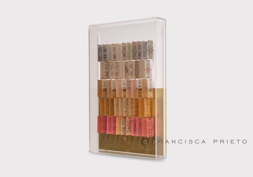 Gold is a shimmering ideal here: tantalising memories, rich and reflective as one’s cultural heritage. Yet the colour of reality dances upon the gilding, bright in blues and pinks, and then more subtle in the paper-coloured tickets of everyday life. The separation between the two is clear, yet the distinction is less marked than the other Echoes series, reflecting the interplay between cultural influences and the undeniable impact of one’s background on their experience.